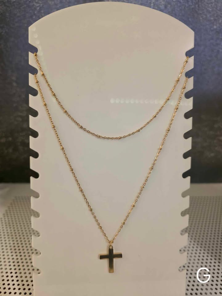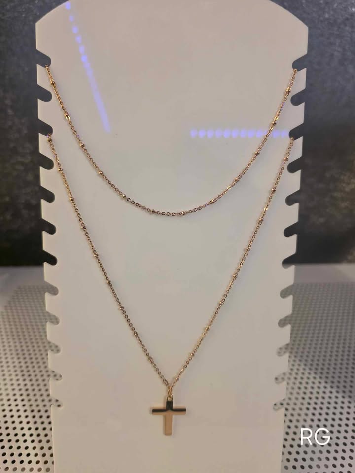 This elegant double layered necklace features a stainless steel cross pendant complemented by delicate beading. The durable stainless steel construction ensures tarnish resistance and longevity, while the layered design adds dimension to any outfit. Perfect for everyday wear or special occasions, this versatile piece combines spiritual symbolism with contemporary style.