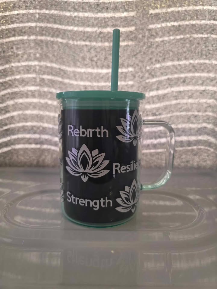 Glass Mug with Handmade Lotus and Inspirational Design. Black inserts are for visual purposes only.