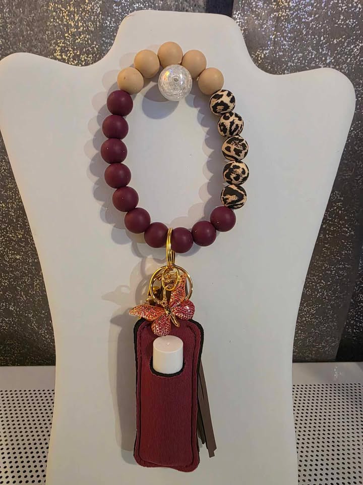 Handmade Burgundy Wristlet with Leopard print Burgundy Silicone Beads. This Wristlet also includes a Butterfly Charm a Lip balm Holder, Lip balm and Tassel.