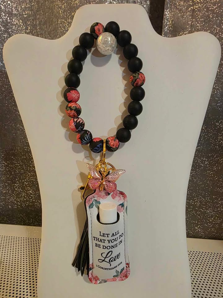 Handmade Black, Red, Green Keychain Wristlet comes with a Lip Balm Holder, Lip Balm, Tassel and a Charm