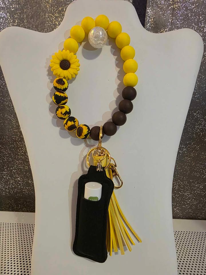 Handmade Sunflower themed Keychain Wristlet, Comes with the Lip Balm Holder, Lip Balm, Charm and Tassel