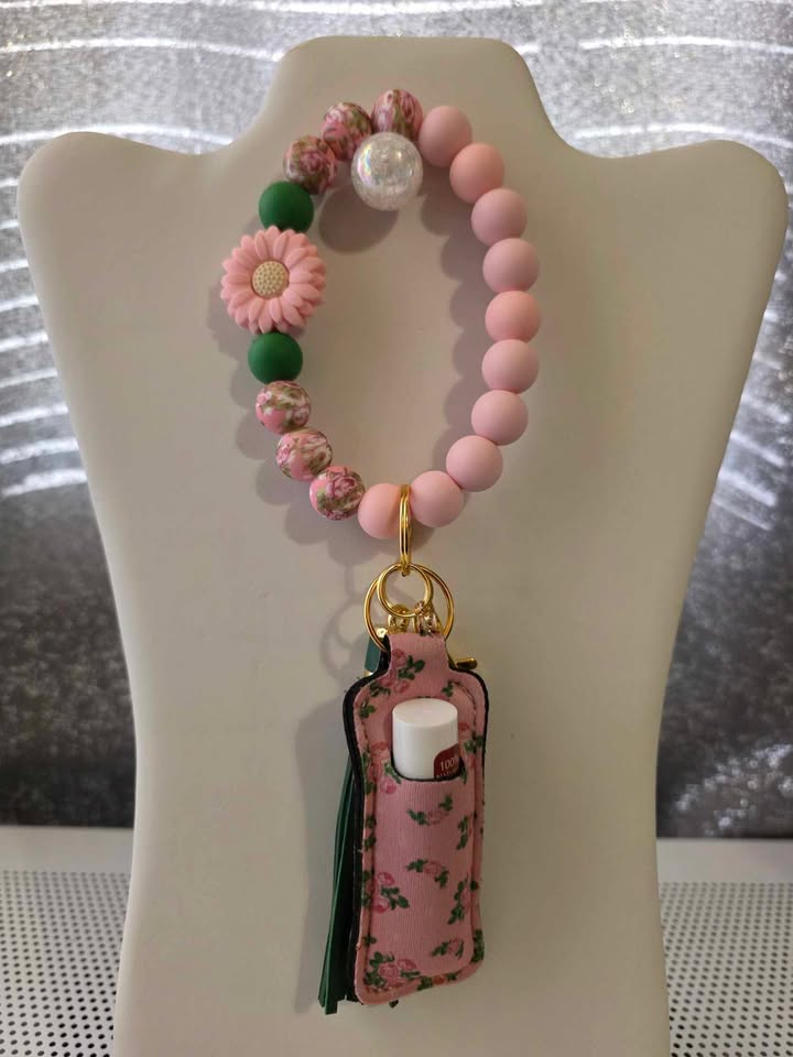 Pink and Green with Pink Flower Keychain Wristlet, this wristlet also comes wit a Lip Balm Holder, Lip Balm, Tassel and a charm.