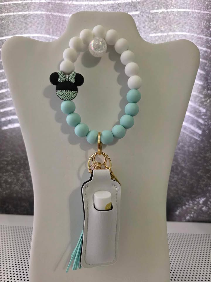 Mint and White Mouse with Bowtie Keychain Wristlet, this wristlet also comes wit a Lip Balm Holder, Lip Balm, Tassel and a charm.