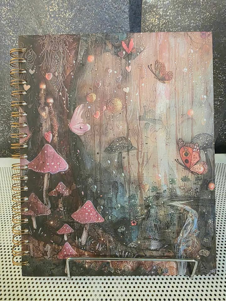 This meticulously crafted spiral journal features a distinctive mushroom field design. Each journal is individually handmade, ensuring unique characteristics in every piece. The spiral binding allows for flat opening and seamless page turning, ideal for artists, writers, and naturalists who appreciate both aesthetic quality and durability in their journaling tools.